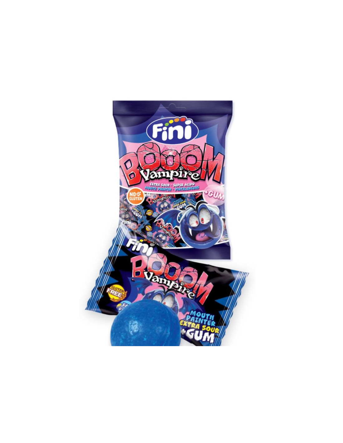Cada caja de Fini Boom Vampire contiene 15 bolsas de caramelos duros con relleno de chicle super ácido y pintalenguas. Estos caramelos ofrecen un sabor explosivo y un efecto divertido que tus clientes adorarán.