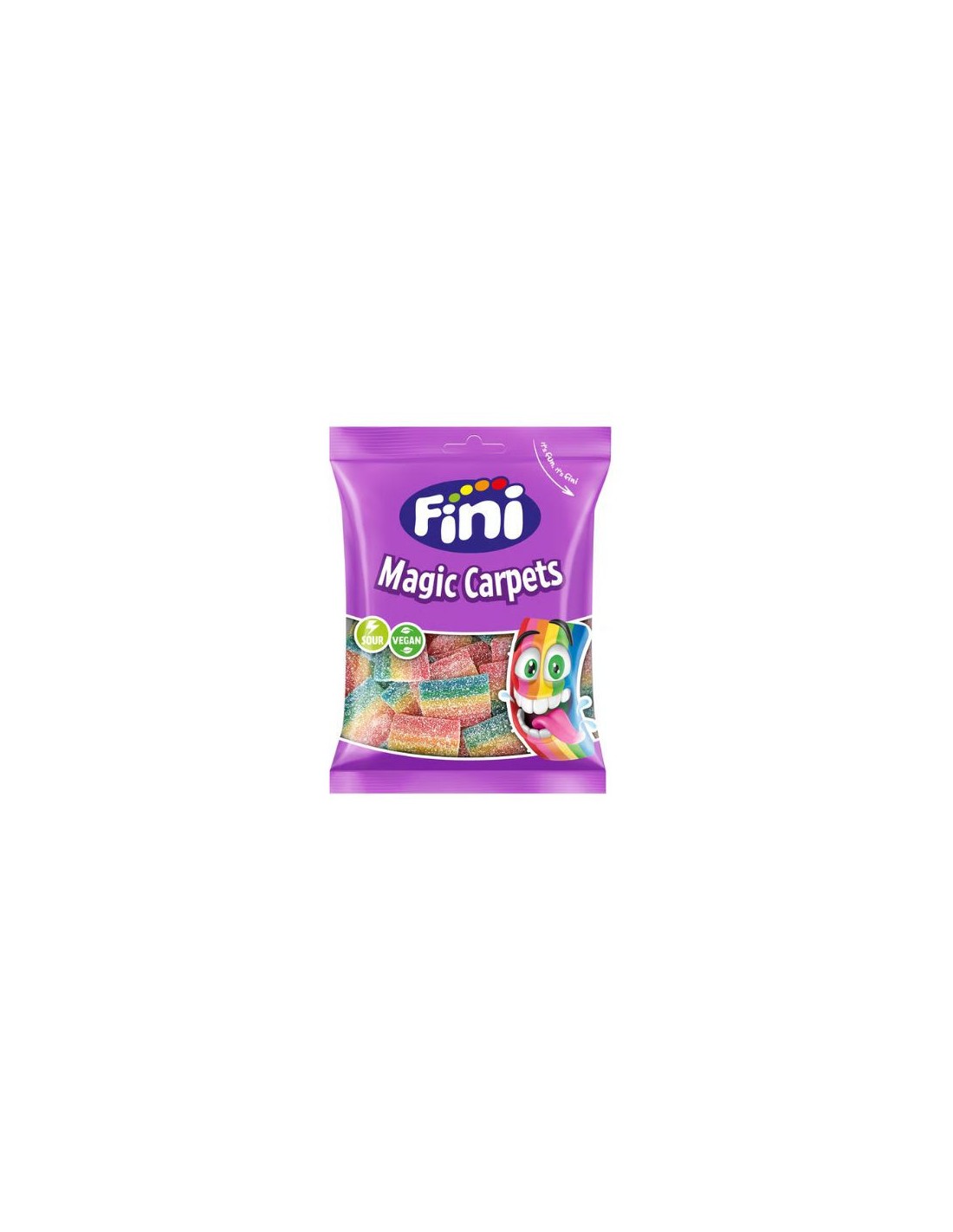 Cada caja de Fini Magic Carpets contiene 12 bolsas de 90 gramos, repletas de golosinas de regaliz multifruta recubiertas de azúcar. Su forma única de alfombra con colores del arcoíris y su sabor irresistible las hacen indispensables en cualquier negocio de vending.